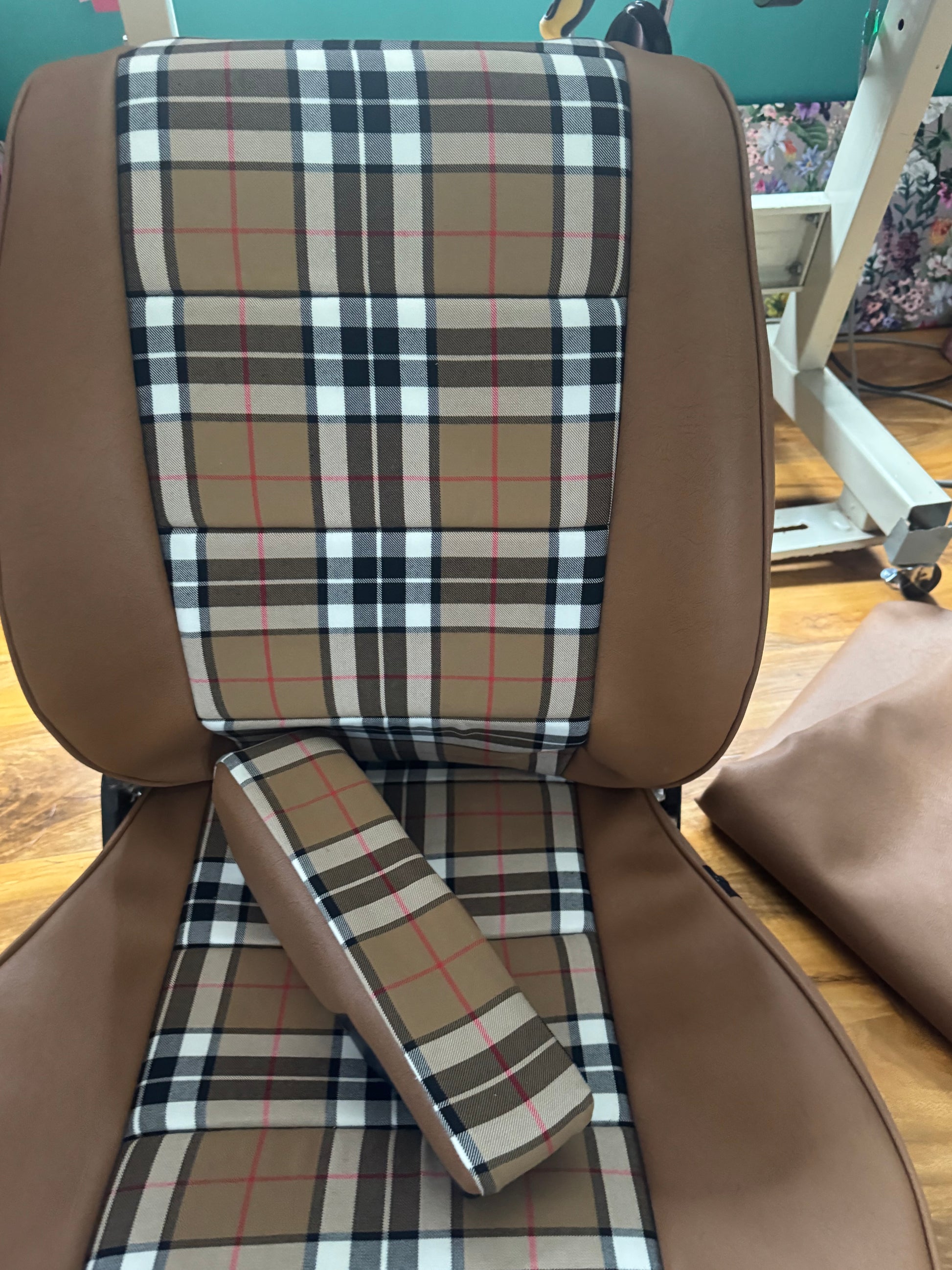 VWT 25/T3 fitted seat covers. Made with Thompson camel Tartan and Jaguar cinnamon vinyl these seat covers are designed to fit your T25